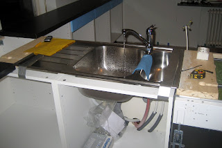 Bjarne och Siv kom en runda idag igen... det behövdes hjälp med bänkskivorna. Men nu är de också färdiga (förutom den lilla måttbeställda del som ska hålla vasken).