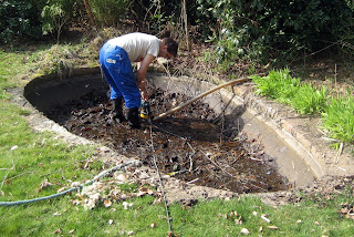 När dammen rengjorts hittade vi en extended family... Ett gäng salamandrar som numera huserar i friskt och fräscht vatten i dammen. (På bilden syns en krypa fram under stenen)